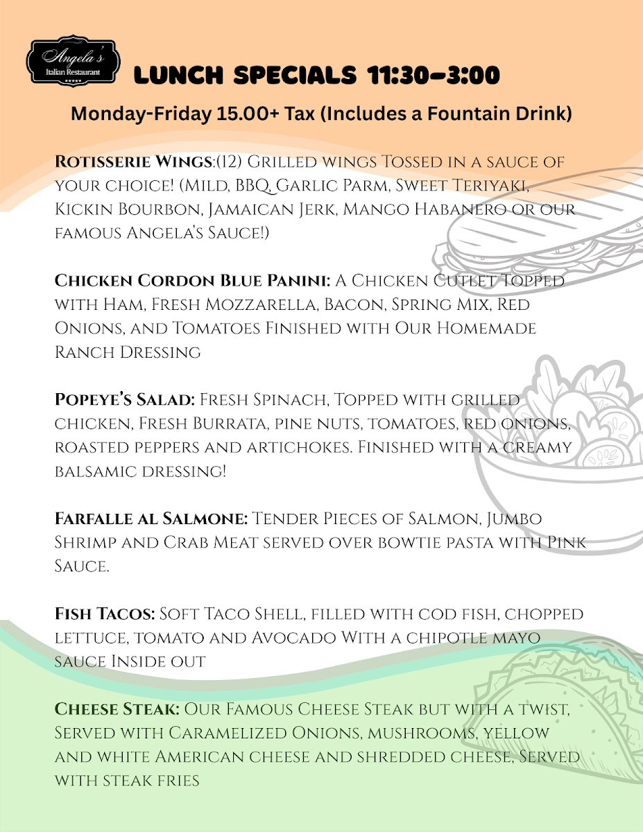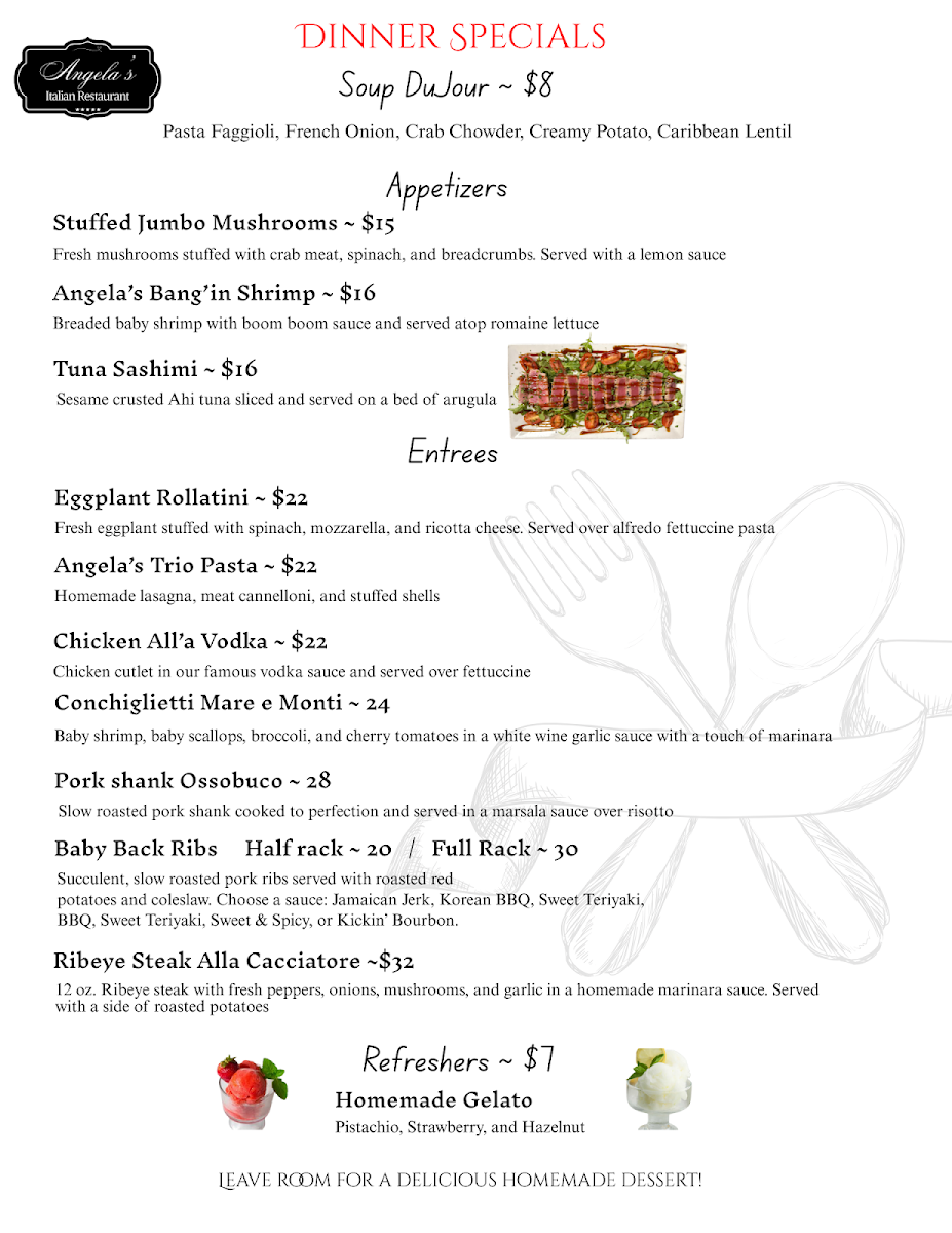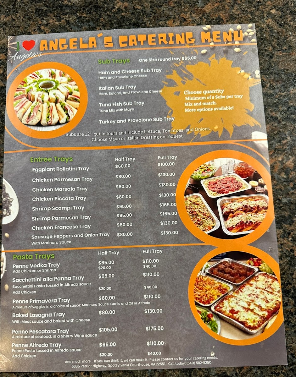 Step into Angela's Italian Restaurant, where each dish tells a story of rich tradition and bold flavors. The Angela's Italian Restaurant Menu offers a delightful variety of authentic Italian dishes, each crafted with love and the finest ingredients. Whether you're in the mood for a comforting plate of pasta, a sizzling pizza topped with fresh ingredients, or a flavorful seafood dish, there’s something for every palate here. From classic favorites like lasagna to unique specials that change with the seasons, the menu promises a satisfying experience for all. Pair your meal with a glass of Italian wine or a refreshing cocktail to make it an unforgettable dining experience. Every visit feels like a culinary journey to Italy, right here in Spotsylvania Courthouse.