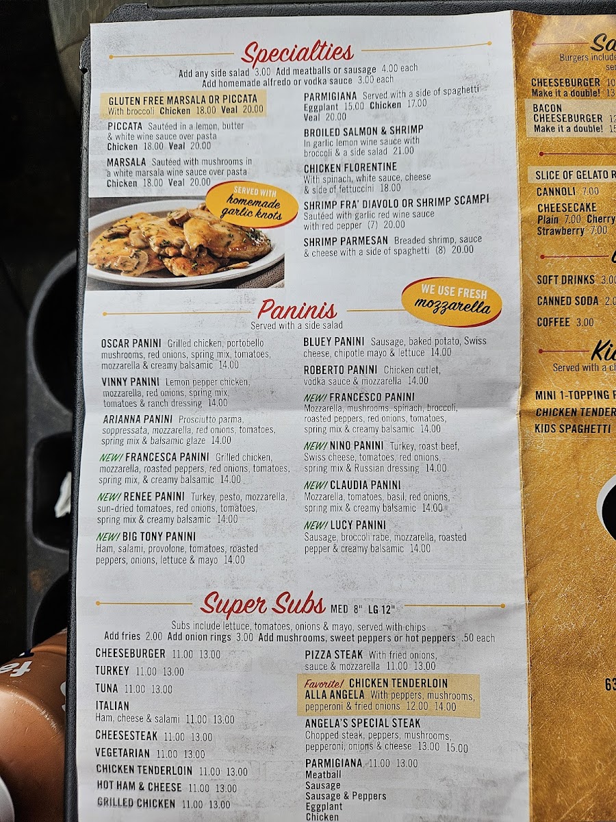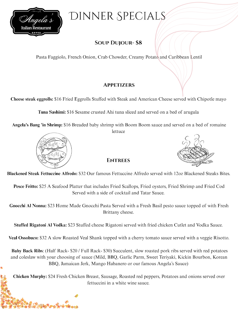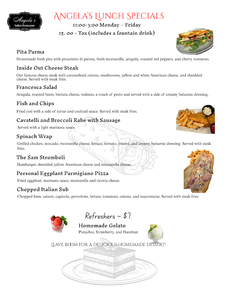 Step into Angela's Italian Restaurant, where each dish tells a story of rich tradition and bold flavors. The Angela's Italian Restaurant Menu offers a delightful variety of authentic Italian dishes, each crafted with love and the finest ingredients. Whether you're in the mood for a comforting plate of pasta, a sizzling pizza topped with fresh ingredients, or a flavorful seafood dish, there’s something for every palate here. From classic favorites like lasagna to unique specials that change with the seasons, the menu promises a satisfying experience for all. Pair your meal with a glass of Italian wine or a refreshing cocktail to make it an unforgettable dining experience. Every visit feels like a culinary journey to Italy, right here in Spotsylvania Courthouse.